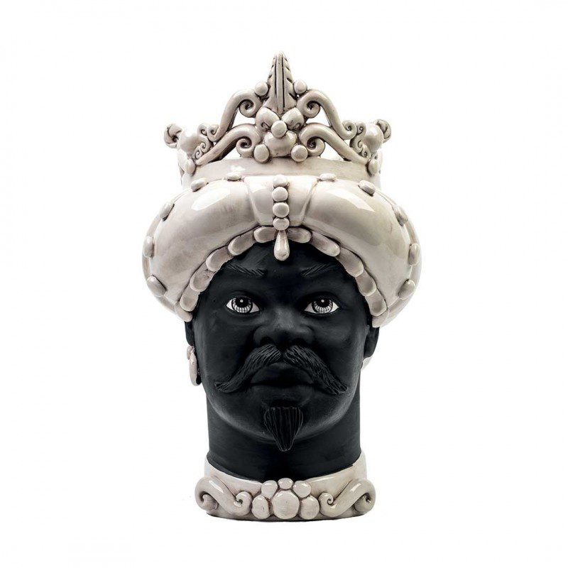 Tratti delicati per questa Testa di Moro in ceramica di Caltagirone dal volto nero satinato e le finiture in bianco antico. Prodotta artigianalmente e realizzata a mano, è un complemento d’arredo perfetto per interni contraddistinti da ambienti con un design tradizionale.